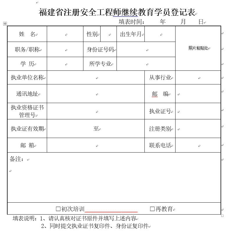 2.集中培训时需提交:《福建省注册安全工程师继续教育登记表》原件、《注册安全工程师执业资格证书》复印件一份、身份证复印件一份;近期免冠彩色红底二寸照片一张。